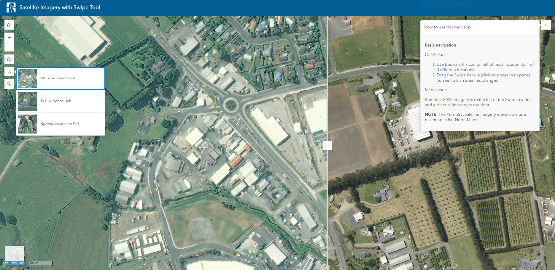 The new satellite imagery map includes a swipe tool that lets you compare the latest view of the region to older aerial images, allowing users to see how an area has changed over time. For example, by using the slider, users can see how Waipapa has changed as the Waipapa roundabout and new retail areas have been added. This function allows for seamless visual comparison between current satellite images and aerial photos. You can view the map here.