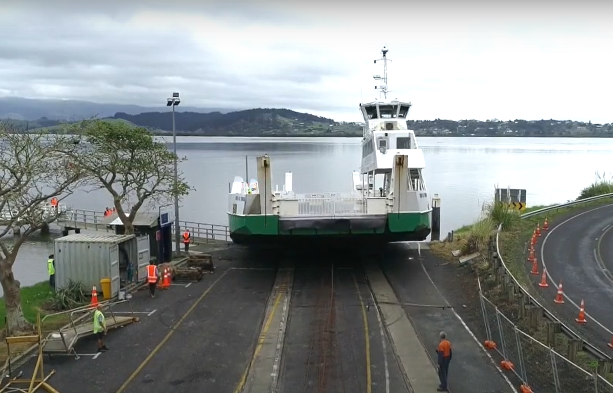 Watch our video of the 145-tonne Hokianga vehicle ferry being pulled out of the water for required maintenance. A replacement passenger-only ferry service is operating to the normal timetable during this time.